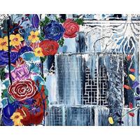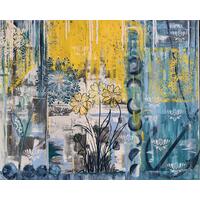 A stunning violet floral close-up to grace your home. The brick texture and minimalist silver outlining add a unique, modern edge to this classic beauty. This piece is acrylic on canvas, 12x12".